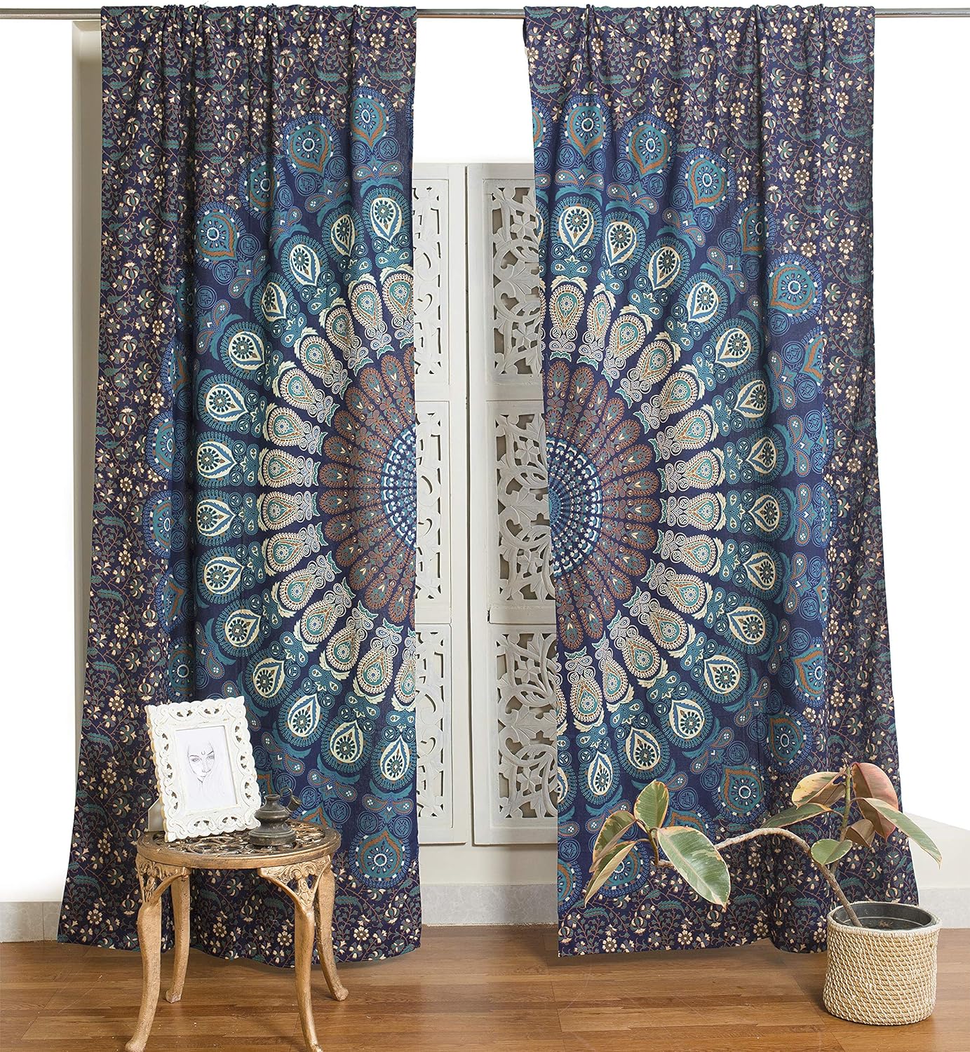 Beautiful Bohemian Psychedelic Hippie Tree of Life Window Curtain (Blue Gold Flower)